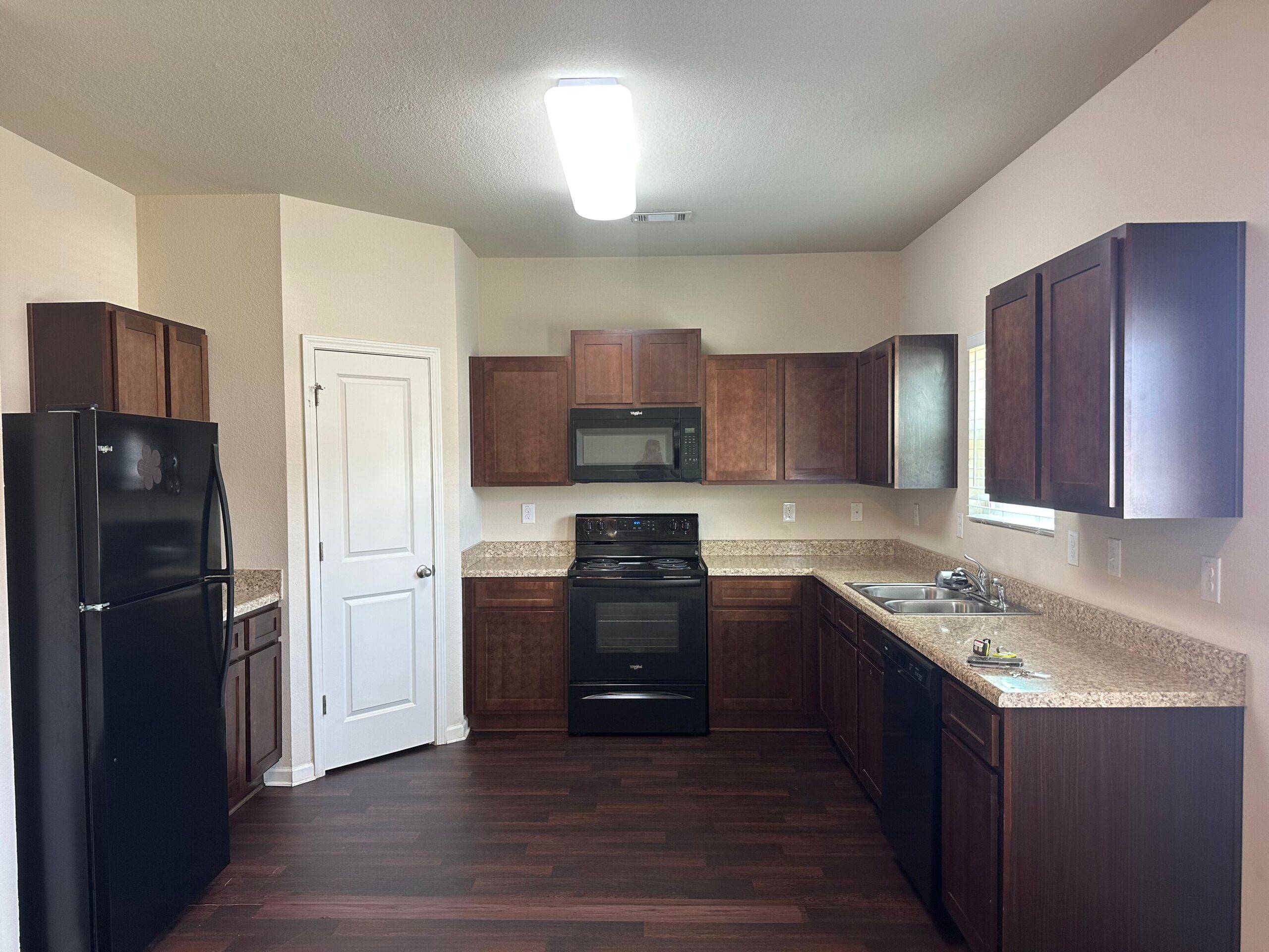 The kitchen features rich dark wood cabinetry, sleek granite-style countertops, and black appliances, all opening into a bright, open-concept living area with plenty of natural light. Upstairs, you'll find four generously sized bedrooms with soft carpet and neutral tones throughout. The primary suite includes a private bathroom and a large walk-in closet for added comfort and convenience.